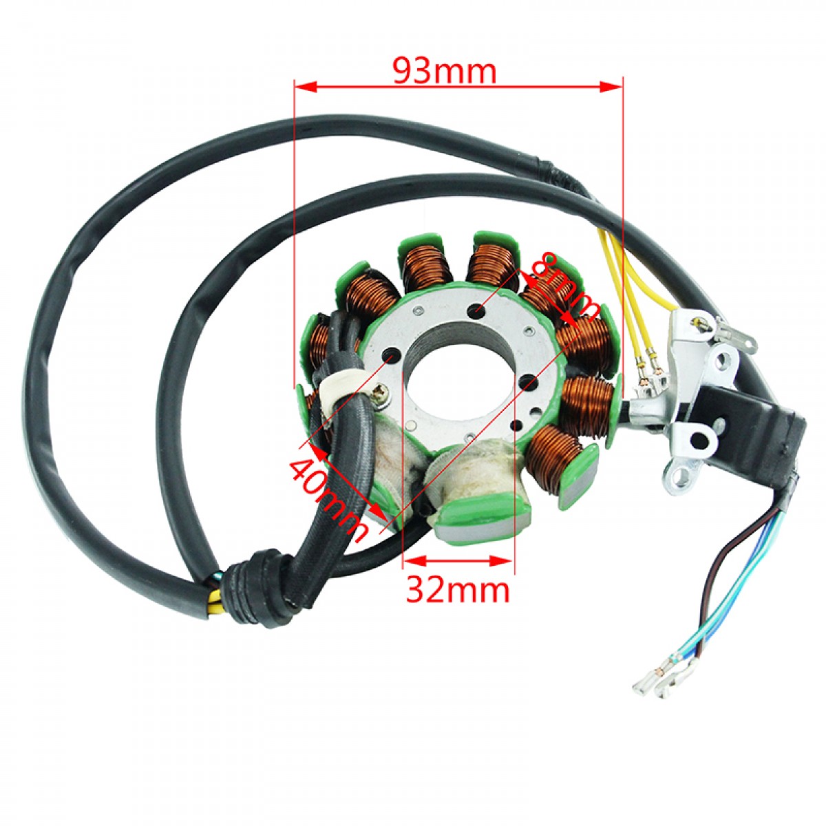 AC статор 11бр намотки 3 отвора за захващане 3 жълти кабела, син, зелен, червен